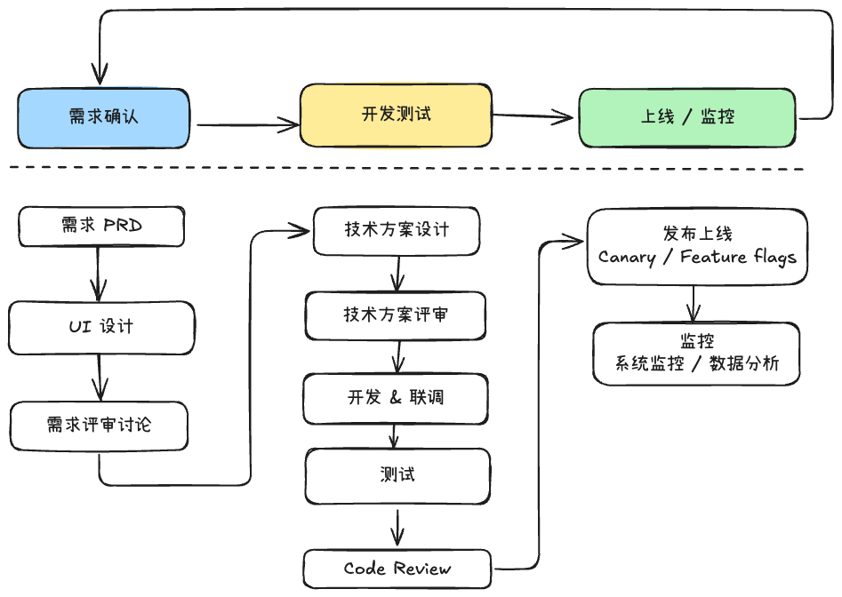 每个阶段都有专属的工具、流程、规范,和负责的人员。大家在整个流程中互相协作,把一个需求想法转化为一个上线的功能。